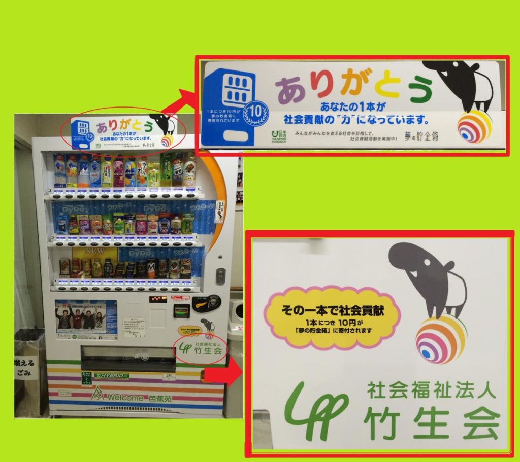 芭蕉苑 介護老人福祉施設に設置している自動販売機は「夢の貯金箱」と言います。